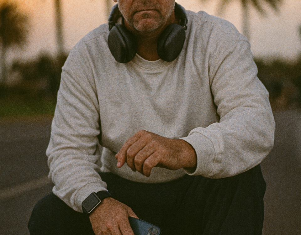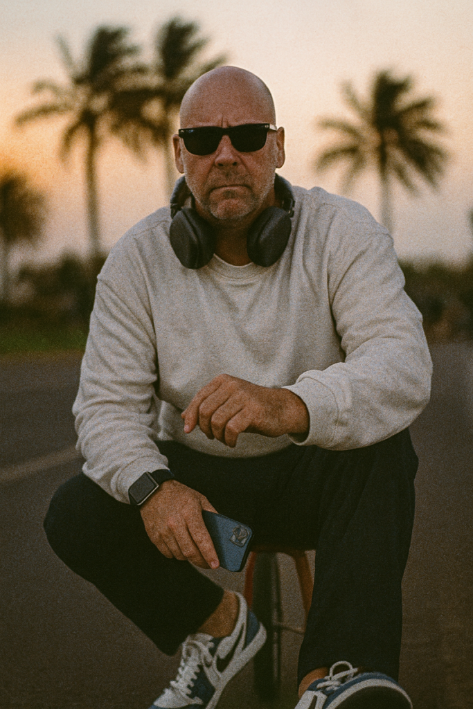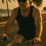 High-contrast cinematic portrait of me riding a small bike along a coastal road at dusk. Wearing a men swimsuit, a tank top and black su glasses. wind blowing through palm trees. Faded summer sunlight, grainy film effect. Slight motion blur on background, sharp focus on me. Ratio 4:3.