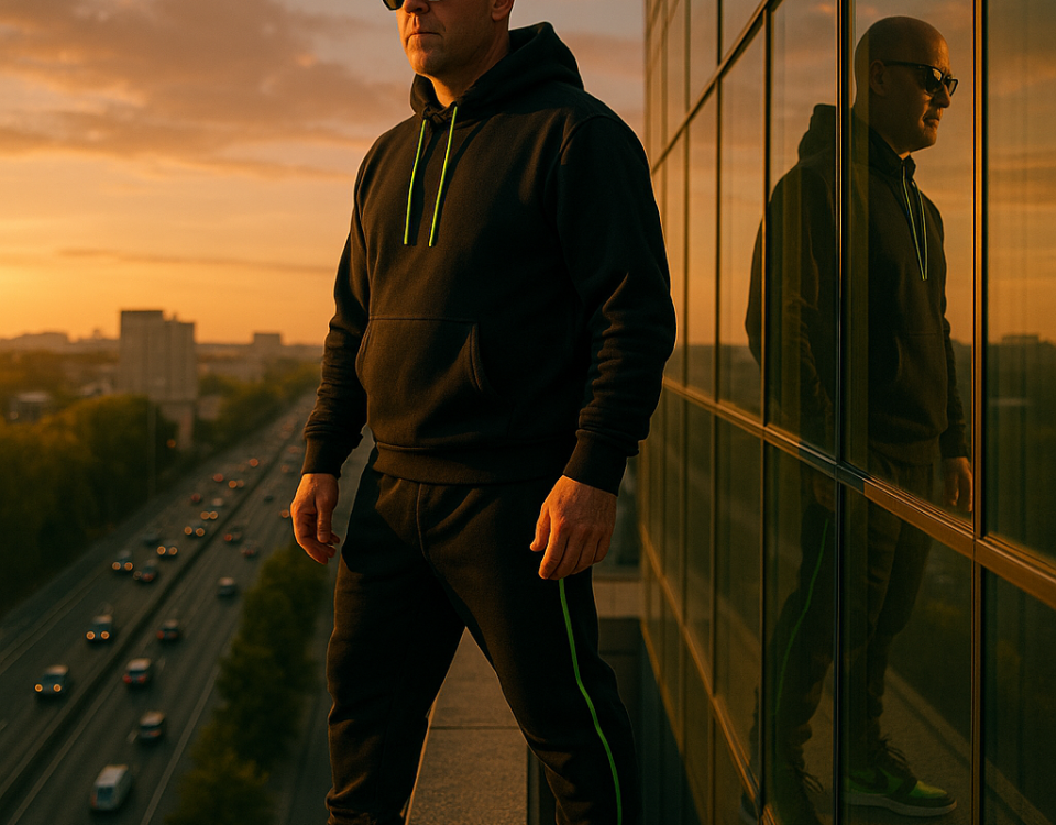 A stylish man standing confidently on the edge of a tall building, overlooking a busy road at sunset. He’s wearing a black hoodie and joggers with neon green accents, and bold green-black sneakers and black sunglasses. The glass office building behind reflects his pose. The cityscape below has cars and trees lining the roads. Cinematic lighting with golden hour tones, dramatic shadows, urban vibe, ultra-realistic. Use the uploaded photo as a reference for the person’s face, pose, and outfit. Perspective from low angle, focus on the subject with slight depth of field. Ratio 4:3. same face, shaved head, clean cut