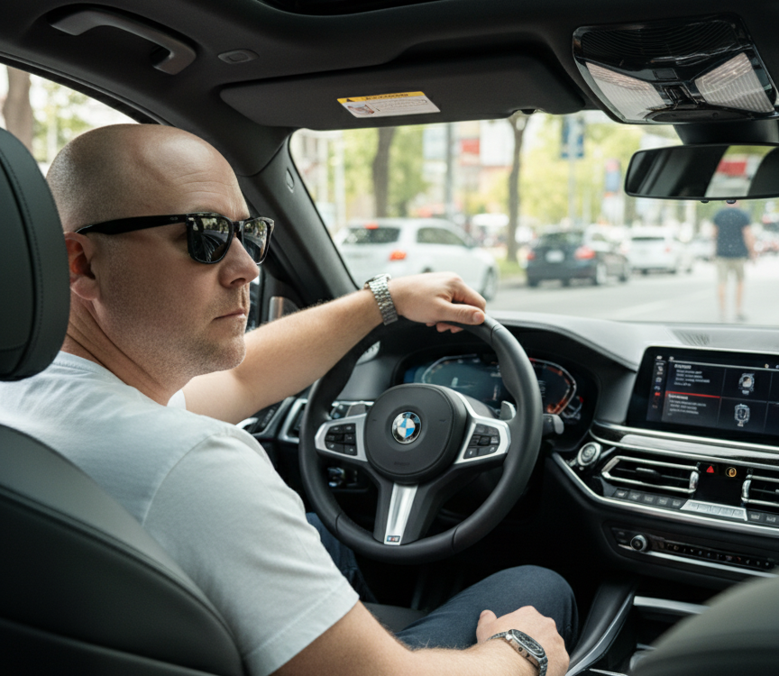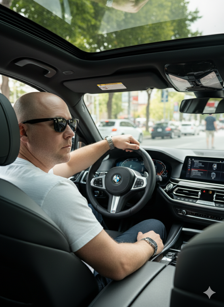 CINEMATIC ULTRA-REALISTIC PHOTO OF [REFERENCE PERSON] SITTING IN THE DRIVER'S SEAT OF A LUXURY BMW, VIEWED FROM BEHIND THE SHOULDER, WITH ONE HAND ON THE STEERING WHEEL. THE PERSON IS WEARING A STYLISH WHITE T-SHIRT, SUNGLASSES, AND A SILVER WATCH. THE CAR INTERIOR IS MODERN, WITH LEATHER SEATS AND A PANORAMIC SUNROOF, ILLUMINATED BY NATURAL DAYLIGHT. IN THE BACKGROUND, THERE IS A BUSY URBAN STREET WITH TREES, CARS, AND SIGNS, SLIGHTLY BLURRED TO CREATE DEPTH OF FIELD. LIFESTYLE, SUCCESS, LUXURY AESTHETIC. SHARP FOCUS, REALISTIC LIGHTING, HIGH LEVEL OF DETAIL, 8K QUALITY. Clean cut, shaved bald head, same face