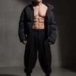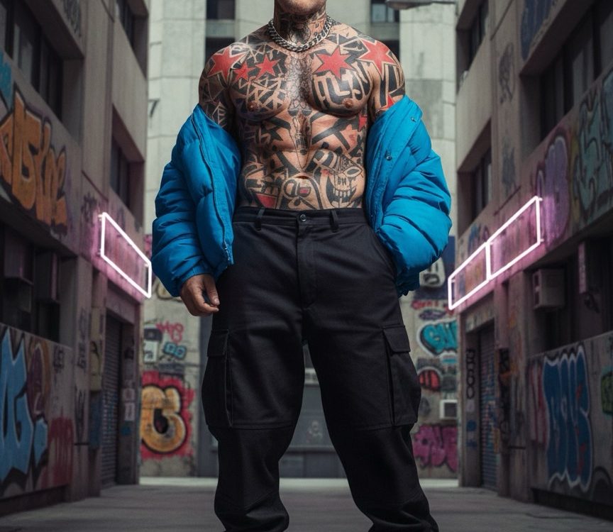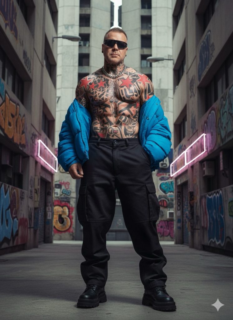 Produce a hyper-realistic image of [attached person photo], fully maintaining their physical and facial characteristics. The setting should be urban, slightly futuristic, with concrete buildings and graffiti. Cinematic lighting should emphasize the defined body, creating the atmosphere of a GQ magazine spread or a Balenciaga campaign. The clothing should be fashion-forward: oversized trousers, chunky boots, and an open jacket in a vibrant color. The image should convey modern masculinity, fully tattooed in a trash polka style,bold style, and the tone of an editorial fashion photoshoot, shaved head, same face, clean cut
