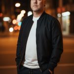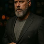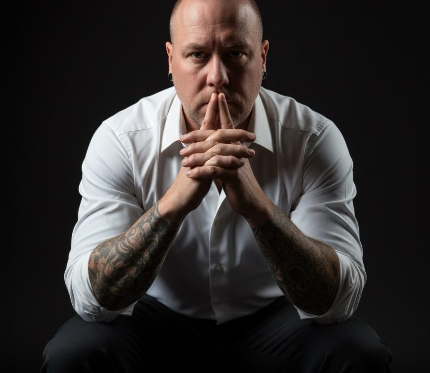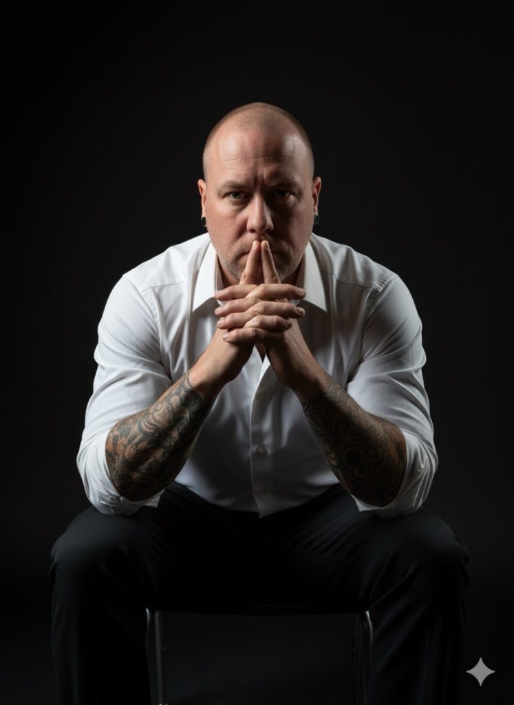 Portrait of me sitting on a chair, leaning slightly forward with elbows resting on my knees, fingers interlocked in front of my mouth in a thoughtful, intense pose. My gaze is directed straight into the camera, creating a strong, focused presence. I'm wearing a tight white dress shirt with the sleeves rolled up to the elbows, showing both of my fully tattooed forearms. Dark, fitted trousers complete the outfit. The lighting is dramatic and low key, with a deep black background that emphasizes the contours of my body and highlights my muscular arms and confident posture. The overall mood is serious, introspective, and powerful. same face.