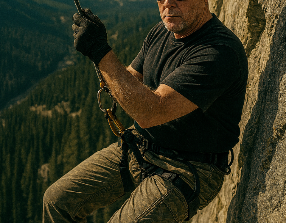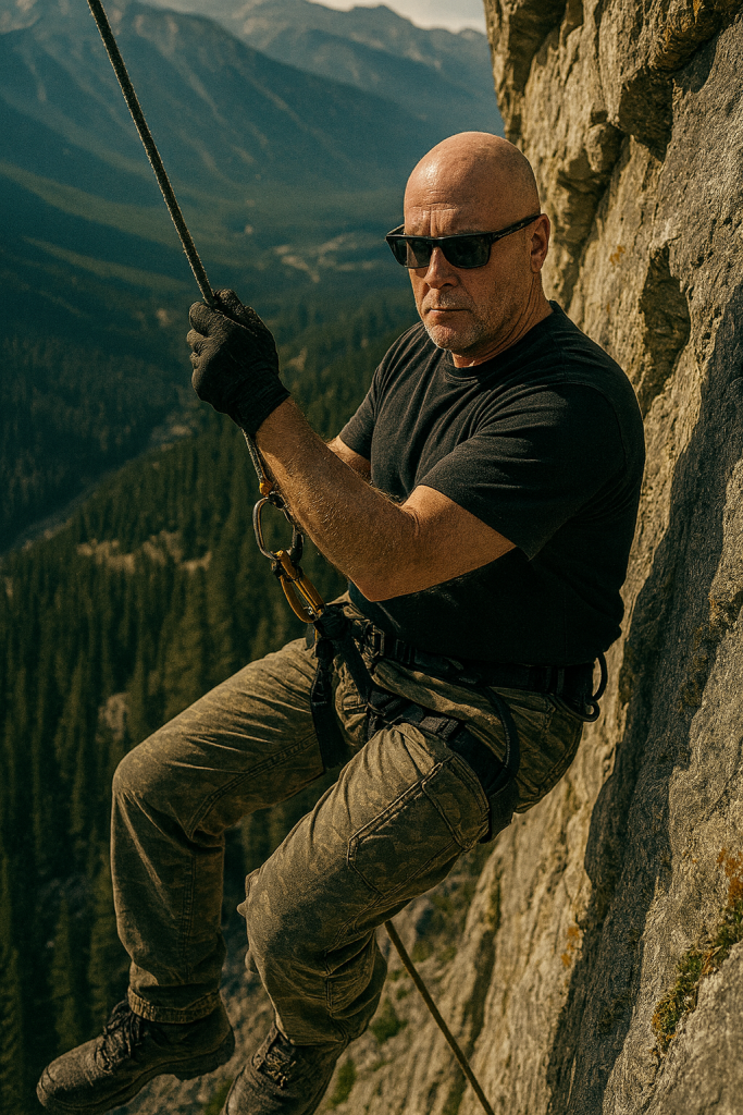 Cinematic action shot of me descending a steep rocky cliff while rappelling down a mountain. I’m wearing black sunglasses, harness, gloves, and outdoor climbing gear, with one hand gripping the rope and feet pressed firmly against the vertical rock face. The background reveals a vast mountainous landscape with forests and valleys far below. Wind blows through my clothes, and sunlight hits the cliffside, casting dramatic shadows. Shot from slightly below to emphasize height and scale. 35mm film aesthetic, natural tones, sharp focus on me, slight blur on background for depth. same face, shaved head clean cut