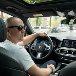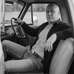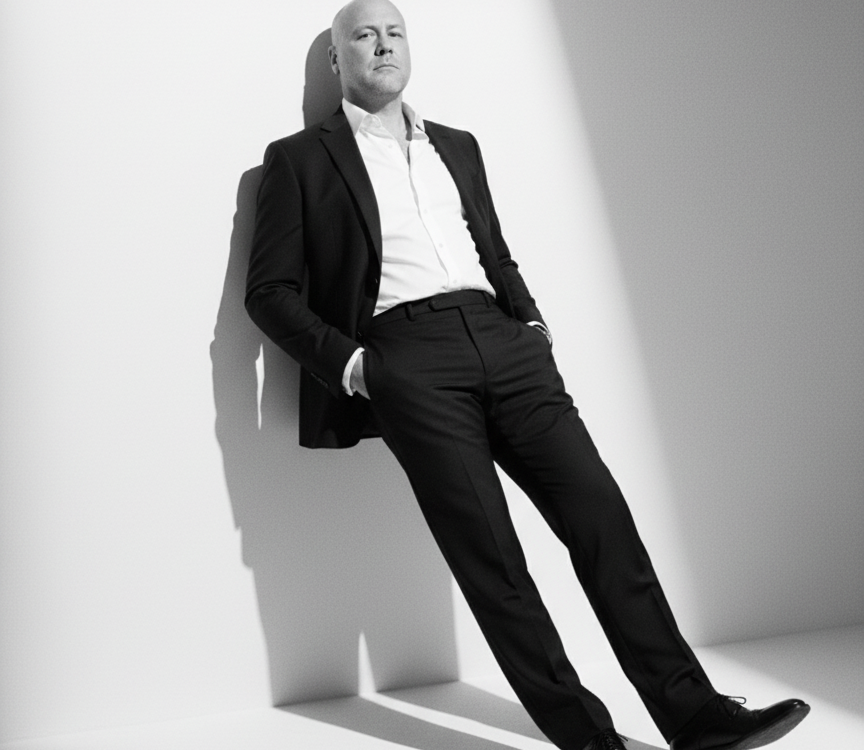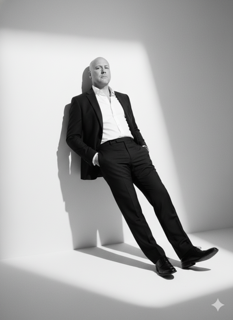 Man (Keep the reference face and body 100%) leaning backward against a wall in a dynamic, unconventional pose, with the body angled sharply and legs extended forward. The expression is intense yet poised, conveying a sense of tension and controlled energy. He wears a tailored dark suit over a crisp shirt, with the collar slightly raised, giving a sculptural, fashion-forward silhouette. The lighting is high-contrast, illuminating the figure cleanly while casting soft shadows on the backdrop, enhancing the sense of depth and structure. The background is minimalist and smooth, allowing the composition to emphasize form and attitude. Captured in elegant black and white with a refined tonal range and impeccable clarity, the image evokes Herb Ritts' signature editorial style for Vogue - bold, graphic, and timeless, with a focus on movement, elegance, and sculptural presence. Clean cut, shaved bald head, same face.