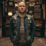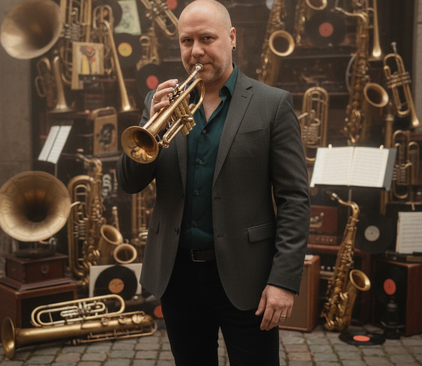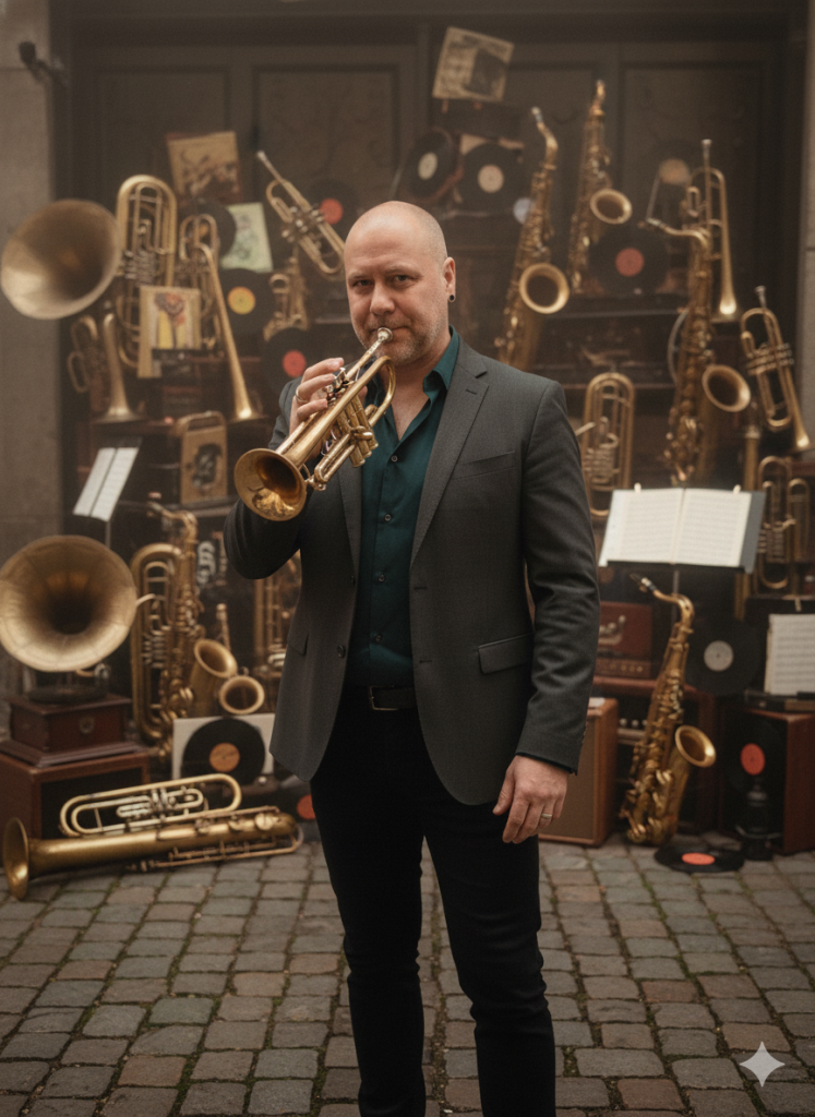 A moody urban portrait of the same person from the reference image with identical facial features and skin tone. Do not alter or stylize the face. Maintain 100% facial accuracy from the reference. He stands on an old European street, amidst a dense arrangement of stacked vintage musical instruments like trumpets, saxophones, gramophones, vinyl records, and sheet music stands, filling the entire background. The equipment is either off or showing subtle reflections and light leaks, adding nostalgic depth. The street is made of aged, worn cobblestones with subtle texture and character. He wears a sharp dark grey blazer over a dark teal open-collar shirt, with slim-fit black trousers. He's wearing a silver ring on his right hand, no other accessories. Man is holding a vintage brass trumpet to his lips, looking directly at the camera with a confident, slightly enigmatic expression. His posture is upright and sophisticated, facing the camera with a relaxed confidence. Lighting is cinematic, with a mix of ambient street light and focused overhead lighting, creating deep shadows under the jawline and dramatic falloff around the edges, with subtle rim light separation from the background. The overall mood is intense and atmospheric, with a film look inspired by analog photography. Color grading should follow a Fuji Classic Chrome aesthetic: warm highlights, rich contrast, subdued shadows, slightly desaturated colors, non-blue tones, and a subtle brown cinematic mood. Add fine film grain, soft vignette, and realistic lens texture. Shot on a 35mm lens, f/2.8 aperture, ISO 400, shutter speed 1/125, eye-level framing. Shallow depth of field with the vintage musical instruments slightly blurred behind for depth. No distortion, no Al arti facts, no cartoon look—ultra-realistic, premium portrait style. Style keywords: cinematic portrait, 35mm film look, analog texture, dramatic mood, Indian street retro, nostalgic music, clean and realistic skin details, sharp eyes, emotional tone, editorial male portrait, cultural urban.