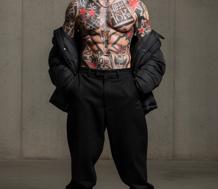 Create a hyper-realistic full-body fashion photo of an adult man with a lean, muscular build. He is shirtless, wearing oversized black wide-leg trousers and chunky black boots. A black puffer jacket hangs loosely off his shoulders, exposing toned abs and chest. His body is fully tattooed in a trash polka style,He also wears black glasses and a silver necklace. He stands confidently with both hands in his pockets, exuding a cool, model-like atitude. Shaved head, same face, clean cut.
