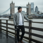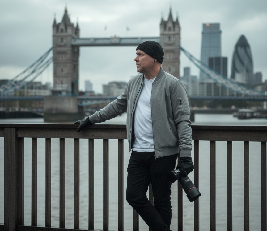 4K ultra-realistic cinematic full-body portrait of the same man - keep his face exactly the same as the uploaded photo, do not change or edit his face. He is leaning against the railing of the wooden riverside deck near Tower Bridge, one hand resting on the railing and the other holding his camera down by his side, looking thoughtfully towards the London skyline. The Tower Bridge and cityscape appear softly blurred in the background under a cool, cloudy sky. He is wearing a light grey bomber jacket over a white T-shirt, black pants, brown leather boots, black gloves, and a dark beanie. Soft diffused lighting and subtle reflections on the wet wood create a cinematic, moody tone.
