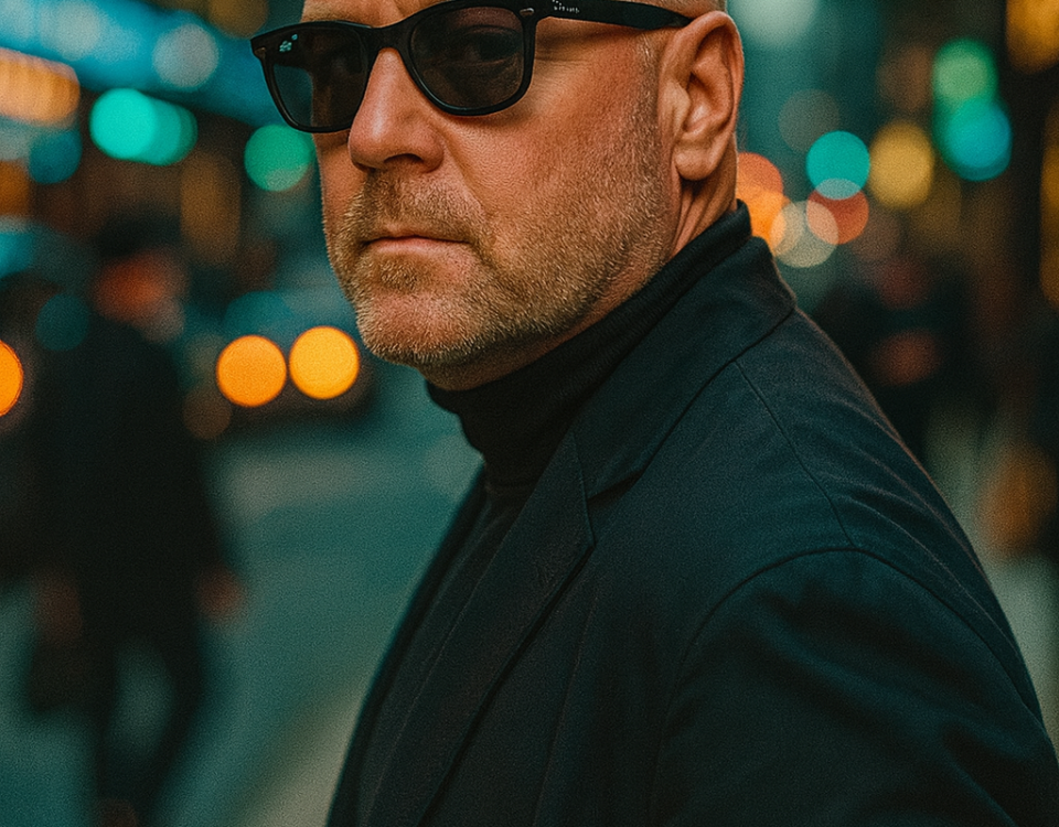 September 7, 2025A stylish man stands on a bustling city street, glancing back over his shoulder. the same face as the uploaded image, wearing ray ban sunglasses. Dressed in a dark turtleneck and a loose black bomber jacket, he exudes cool confidence. The cityscape behind him is softly blurred-awash with colorful lights and out-of-focus pedestrians-1 creating a cinematic, moody depth-of-field effect.
