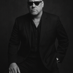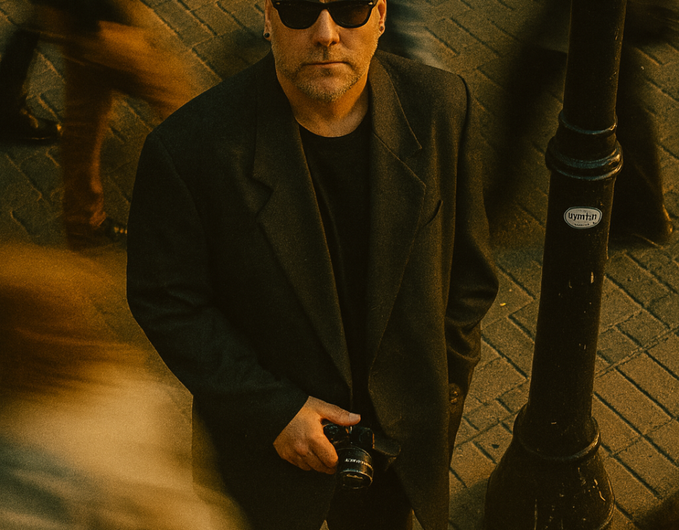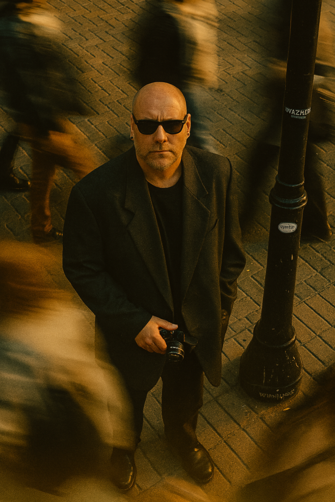 Cinematic overhead shot of me. Standing still a brick city sidewalk, wearing a dark oversized blazer, black sunglasses and earring, motion-blurred crowd rushes past around me, moody lighting 35 mm film look. I am facing slightly sideways but I am looking at the camera. Shallow depth of field, sharp focus on me. Ratio 4:3. Angular picture.