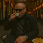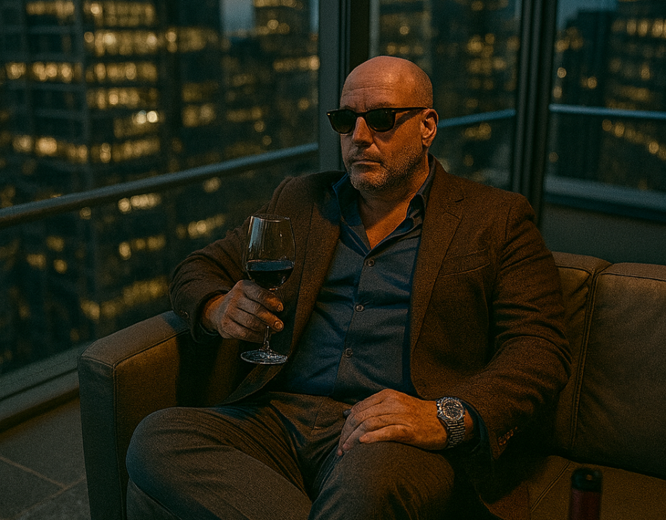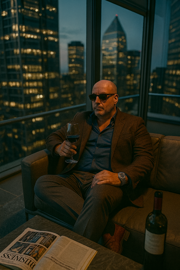 September 7, 2025Hyper-realistic cinematic overhead full-body vertical shot of a stylish young businessman ( use reference image ) lounging on a modern sofa at a skyscraper balcony during evening. Wearing a brown suit over an open-collar blue shirt, grey trousers, polished shoes, luxury watch, and Wayfarer sunglasses. Holding a wine glass, legs crossed, relaxed posture. Table with magazines, newspaper, wine bottle in front. 8k.